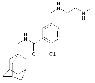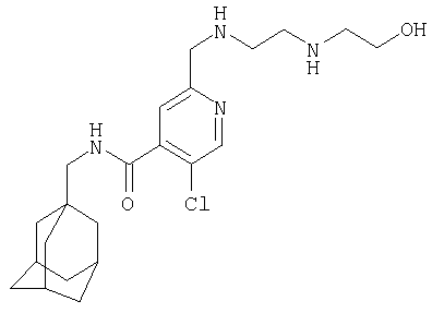 (1) N-(1-Адамантилметил)-5-хлор-2-винилизоникотинамид N-(1-Адамантилметил)-2,5-дихлоризоникотинамид (2,32 г) и трибутил(винил)станнан (2,61 г) смешивали в сухом N,N-диметилформамиде (50 мл) при комнатной температуре под азотом и обрабатывали несколькими кристаллами 2,6-ди-трет-бутил-4-метилфенола и дихлор[бис(трифенилфосфин)]палладием(II) (0,24 г). Реакционную смесь нагревали до 80°С в течение 4 часов и затем охлаждали до комнатной температуры. Смесь вливали в этилацетат (50 мл) и промывали водой (2×25 мл), затем рассолом (30 мл). Органические слои высушивали над безводным сульфатом магния, фильтровали и концентрировали. Остаток очищали посредством хроматографии на силикагеле, элюируя смесью этилацетат:дихлорметан (1:20) с получением указанного в подзаголовке соединения (2,21 г). 1H-ЯМР (300 МГц, CDCl3) MC: ХИАД(+ve) 331, 333 (М+1). (2) N-(1-Адамантилметил)-5-хлор-2-формилизоникотинамид N-(1-Адамантилметил)-5-хлор-2-винилизоникотинамид (Пример 29(1)) (1,70 г) растворяли в дихлорметане (50 мл), обрабатывали уксусной кислотой (1 мл) и охлаждали до -78°С под азотом. Через полученный раствор продували озон в течение 2 часов, поддерживая температуру. Затем через раствор продували азот в течение 10 минут и добавляли диметилсульфид (2 мл). Раствор нагревали до комнатной температуры, промывали бикарбонатом натрия (2×10 мл) и рассолом (30 мл); органическую фазу высушивали над безводным сульфатом магния, фильтровали и концентрировали. Остаток очищали посредством хроматографии на силикагеле, элюируя смесью этилацетат:дихлорметан (1:20) с получением указанного в подзаголовке соединения (1,13 г). 1Н-ЯМР (300 МГц, CDCl3) MC: ХИАД(+ve) 333, 335 (М+1). (3) N-(1-Адамантилметил)-5-хлор-2-({[3-метиламино)пропил]амино}метил)изоникотинамида дигидрохлорид N-(1-Адамантилметил)-5-хлор-2-формилизоникотинамид (Пример 29(2)) (0,2 г) растворяли в метаноле (10 мл) и добавляли трет-бутил-3-аминопропил(метил)карбамат (0,39 г) вместе с уксусной кислотой (0,2 мл). Смесь перемешивали в течение 15 минут при температуре окружающей среды и затем прибавляли триацетоксиборгидрид натрия (0,25 г) и реакционную смесь перемешивали в течение 20 часов, концентрировали и остаток распределяли между 2 М водным раствором соляной кислоты (10 мл) и этилацетатом (10 мл). Слои разделяли и органическую фазу повторно экстрагировали 2 н. соляной кислотой (2×10 мл). Объединенные водные экстракты подщелачивали 5 М водным раствором гидроксида аммония, экстрагировали в этилацетат (2×25 мл) и объединенные экстракты высушивали над безводным сульфатом магния, фильтровали и концентрировали. Остаток растворяли в дихлорметане и обрабатывали сухим хлористым водородом в 1,4-диоксане (4 н., 1 мл) и концентрировали через 2 часа с получением депротектированного вещества. Остаток перекристаллизовывали из дихлорметана (10 мл) с получением указанного в заголовке соединения (0,110 г). 1H-ЯМР (300 МГц, CD3OD) MC: ХИАД(+ve) 405, 407 (М+1). Т.пл.: 285-287°С. Пример 30 N-(1-Адамантилметил)-5-хлор-2-[({2-[(2-гидроксиэтил)амино]этил}амино)метил]изоникотинамида дигидрохлорид