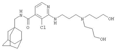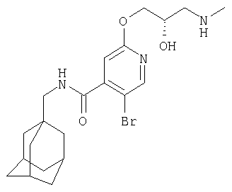 (1) N-(1-Адамантилметил)-5-бром-2-метоксиизоникотинамид Н-бутиллитий (2,51 мл 2,5 М раствора в гексанах) добавляли к диизопропиламину (0,88 мл) в сухом тетрагидрофуране (15 мл) при -65°С. К этому раствору по каплям прибавляли раствор 5-бром-2-метоксипиридина (0,82 мл) в сухом тетрагидрофуране (10 мл) в течение 30 минут при -65°С. Затем небольшими порциями прибавляли раствор 1-адамантилметилизоцианата (1 г) в сухом тетрагидрофуране (10 мл) в течение 30 минут при -65°С. Реакционной смеси позволяли нагреться до 0°С, разбавляли насыщенным рассолом (20 мл) и экстрагировали в этилацетат (3×20 мл). Объединенные экстракты высушивали над безводным сульфатом натрия, фильтровали и концентрировали. Остаток очищали посредством хроматографии на силикагеле, элюируя смесью дихлорметан:ацетон (от 19:1 до 2,5:1) с получением указанного в подзаголовке соединения (1,1 г) в виде бесцветного порошка. МС: ХИАД(+ve) 381/379 (М+1). (2) N-(1-Адамантилметил)-5-бром-2-гидроксиизоникотинамид Йодид натрия (0,48 г) добавляли к раствору триметилсилилхлорида (0,41 мл) в ацетонитриле (30 мл), и смесь перемешивали в течение 1 часа. Затем добавляли N-(1-адамантилметил)-5-бром-2-метоксиизоникотинамид (0,94 г) (Пример 35(1)) и реакционную смесь нагревали при 60°С под азотом в течение 3 часов. Реакционную смесь разбавляли водой (150 мл) и полученное твердое вещество собирали фильтрацией и высушивали путем азеотропной перегонки этанол/толуол. Твердое вещество растирали с диэтиловым эфиром и собирали фильтрацией с получением указанного в заголовке соединения (0,70 г). (3) N-(1-Адамантилметил)-5-бром-2-[(2S)-оксиран-2-илметокси]изоникотинамид Суспензию (S)-глицидилнозилата (0,29 г), карбоната цезия (1,82 г) и N-(1-адамантилметил)-5-бром-2-гидроксиизоникотинамида (0,41 г) (Пример 35(2)) в безводном N,N-диметилформамиде (6 мл) нагревали при 60°С под азотом в течение 2 часов. Реакционной смеси позволяли охладиться до комнатной температуры, разбавляли водой (50 мл) и экстрагировали в этилацетат (3×20 мл). Объединенные экстракты высушивали над безводным сульфатом натрия, фильтровали и концентрировали. Остаток очищали посредством хроматографии на силикагеле, элюируя смесью дихлорметан:этилацетат (от 4:1 до 0:1) с получением указанного в заголовке соединения (0,12 г). МС: ХИАД(+ve) 423/421 (М+1). (4) N-(1-Адамантилметил)-5-бром-2-{[(2S)-2-гидрокси-3-(метиламино)пропил]окси}изоникотинамид Смесь N-(1-адамантилметил)-5-бром-2-[(2S)-оксиран-2-илметокси]-изоникотинамида (0,12 г) (Пример 35(3)), 40%-ного водного метиламина (4 мл) и 1,4-диоксана (4 мл) перемешивали в течение 4 часов. Реакционную смесь концентрировали и остаток очищали посредством хроматографии на силикагеле, элюируя смесью этилацетат:этанол:0,880 аммиака раствор (от 4:1:0,1 до 1,5:1:0,1). Выделенное вещество растворяли в растворе хлористого водорода в 1,4-диоксане (10 мл 4 М раствора) и концентрировали с получением указанного в заголовке соединения (0,039 г). 1H-ЯМР (400 МГц, ДМСО-d6) МС: ХИАД(+ve) 454/452 (М+1). Пример 36 N-(1-Адамантилметил)-2-({3-[бис(3-гидроксипропил)амино]пропил}амино)-3-хлоризоникотинамида дигидрохлорид (1) трет-Бутил-3-[(4-{[(1-адамантилметил)амино]карбонил}-3-хлорпиридин-2-ил)амино]пропилкарбамат N-(1-Адамантилметил)-2,3-дихлоризоникотинамид (0,4 г) и трет-бутил-3-аминопропилкарбамат (0,4 г) в ДМСО (4 мл) нагревали в запаянной трубке при 160°С в течение 5 часов. Добавляли этилацетат и этот раствор промывали раствором NaHCO3, водой, раствором KHSO4 и водой. Раствор высушивали и растворитель 