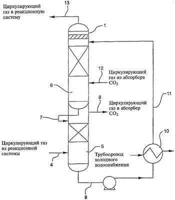Применение настоящего изобретения в форме, представленной на чертеже, обеспечивает ряд существенных преимуществ по сравнению с известными системами. Помимо рекуперации тепла циркулирующего газа, выходящего из абсорбера СО2, можно применить весьма высокие расходы промывочной воды, что обеспечивает более эффективную промывку по сравнению с известной изолированной промывочной системой. Кроме того, падение давления циркулирующего газа меньше, чем в случае использования теплообменника. Это способствует снижению энергозатрат в реакционной системе получения оксида этилена.