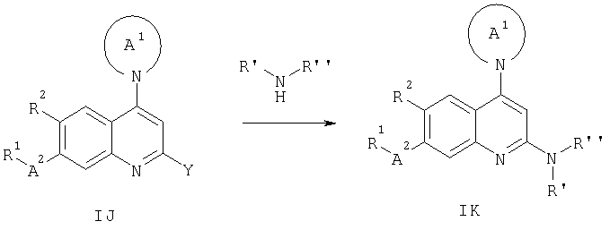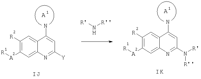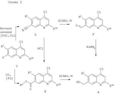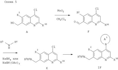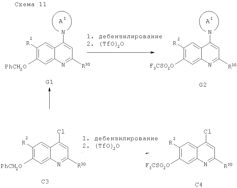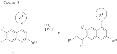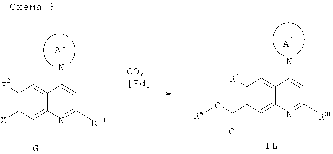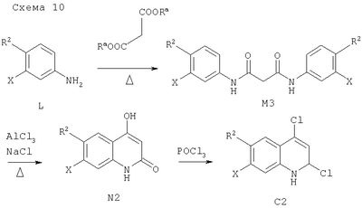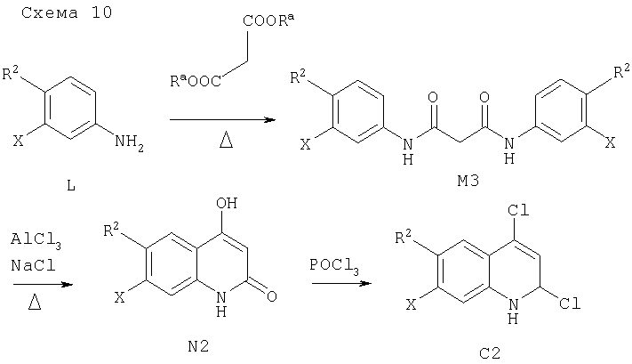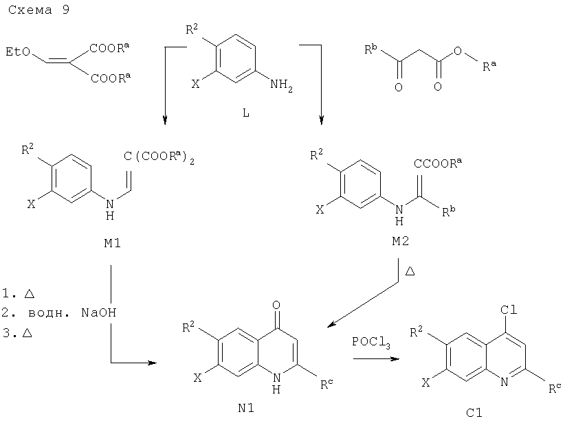 -кетоэфирами в присутствии n-толуолсульфоновой кислоты при температуре дефлегмации циклогексана и удаление в азеотропных условиях воды, которая образуется в процессе реакции, позволяет получать промежуточный продукт М2. Последующее замыкание кольца с удалением одного эквивалента спирта (Ra-OH) достигают путем выдерживания при температуре примерно 250°С в растворителе с высокой температурой кипения, таком как Dowtherm А, с получением 4-хинолона N1 (схема 9).