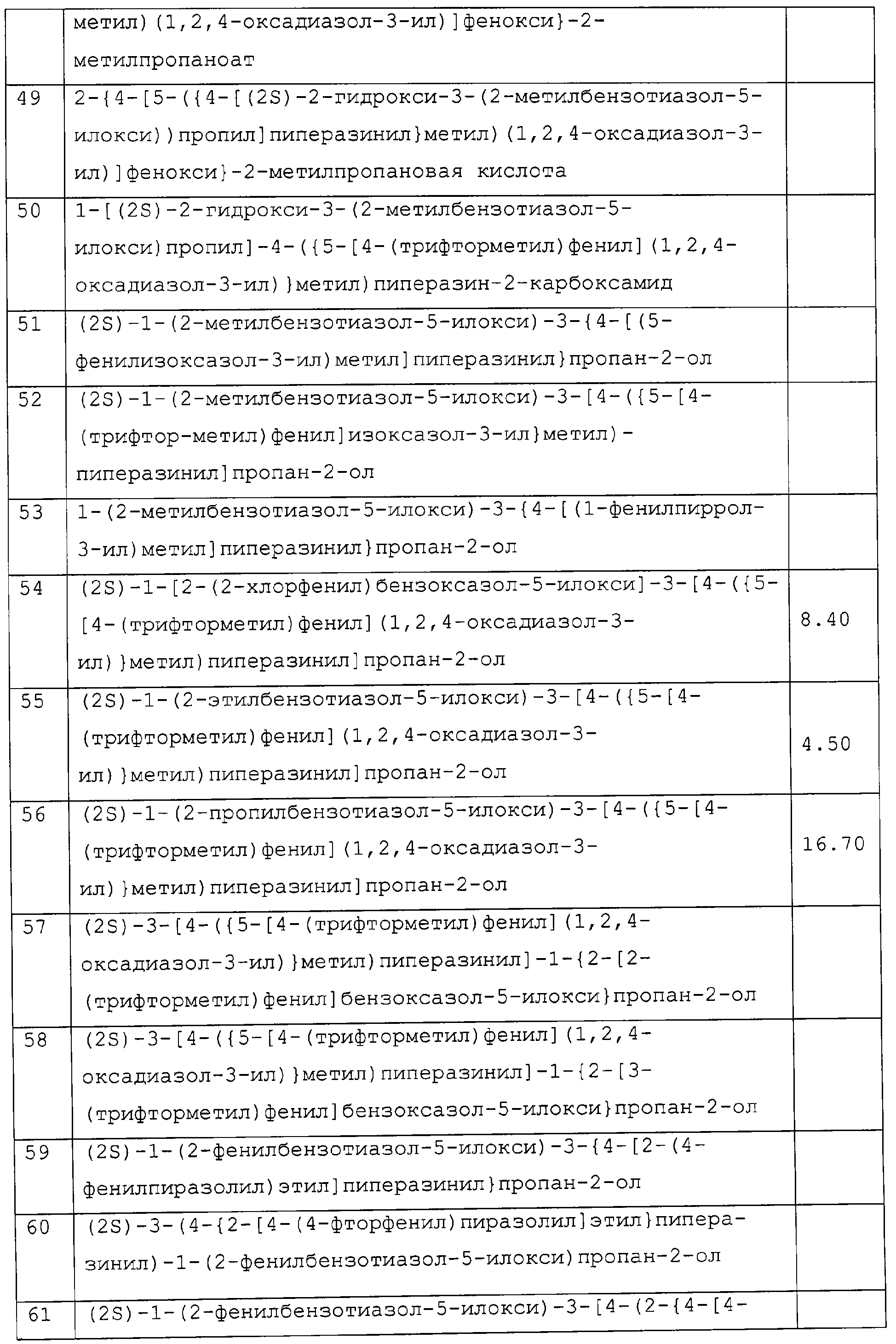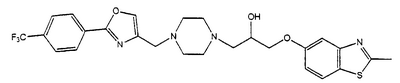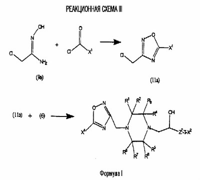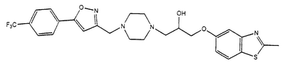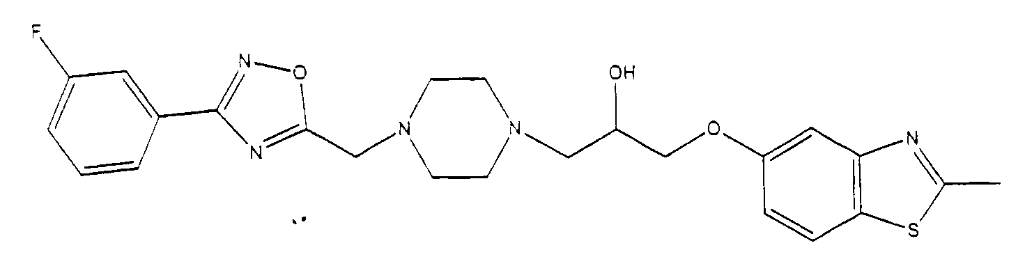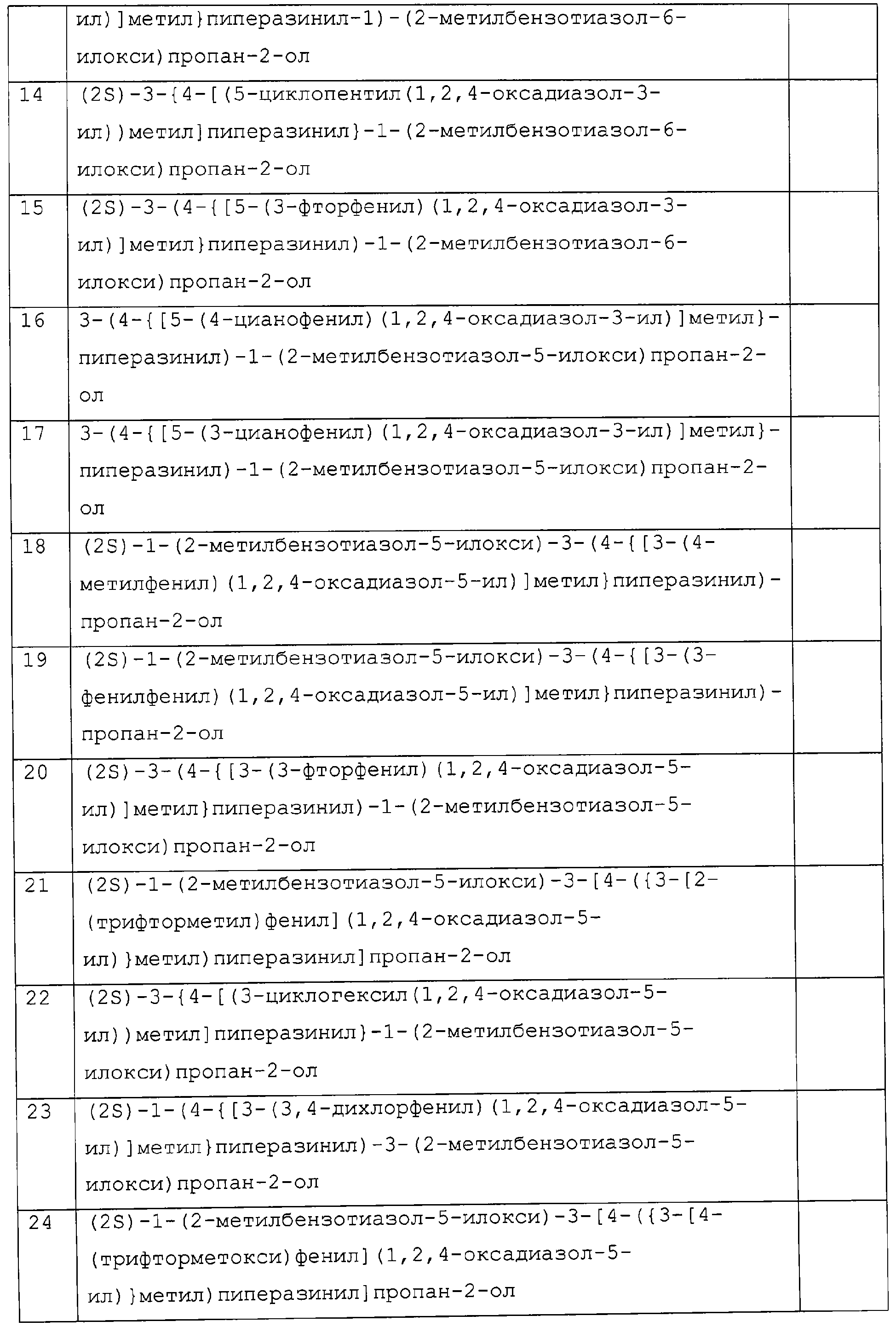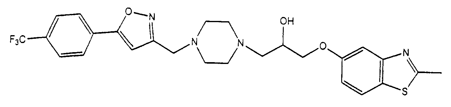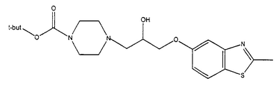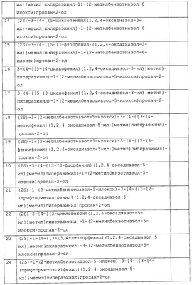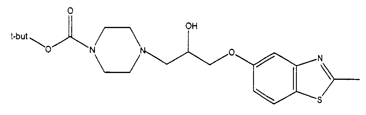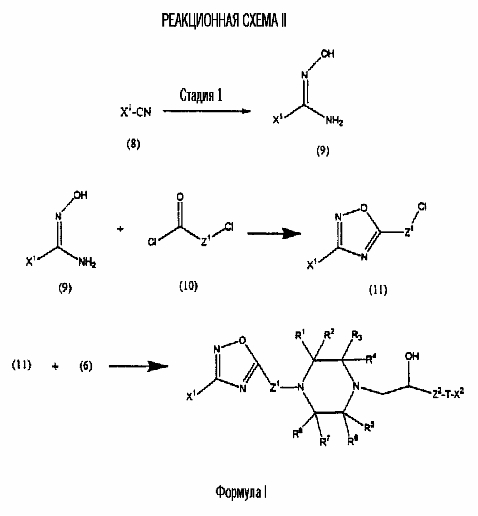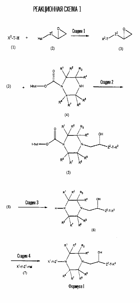представляет коммерчески доступный [(1S,4S)-(+)-2,5-диазабицикло[2.2.1]гептан] или его можно получить по методике, раскрытой в J. Org. Chem., 1990, 55, 1684-7. Аналогично предшественник соединения формулы (4), где R1 и R5, взятые вместе, представляют мостиковую этиленовую группу, и предшественник соединения формулы (4), где R1 и R7, взятые вместе, представляют мостиковую этиленовую группу, можно получить по опубликованной методике, раскрытой в J. Med. Chem., 1974, 17, 481-7. Предшественник соединения формулы (4), где R1, R2, R3, R4, R5, R6 и R7 представляют водород и R8 представляет -C(O)NH2, получают из пиперазин-2-карбоксамида, коммерчески доступного соединения. Стадия 1 – Получение соединения формулы (3) Соединение формулы (3) обычно получают путем взаимодействия соединения формулы (1), например 5-гидрокси-2-метилбензотиазола, с эпоксидом формулы (2). Обычно два соединения смешивают в инертном растворителе, предпочтительно кетоне, например ацетоне, и в присутствии третичного органического основания или неорганического основания, предпочтительно карбоната кальция при температуре около температуры кипения с обратным холодильником в течение примерно 8-48 ч, предпочтительно в течение ночи. Когда взаимодействие по существу закончено, выделяют продукт формулы (3) обычными способами, например фильтрованием, удалением растворителя при пониженном давлении с последующей хроматографией остатка на силикагеле. В альтернативном случае после фильтрования продукт можно кристаллизовать из фильтрата. Стадия 2 – Получение соединения формулы (5) Далее соединение формулы (3) подвергают взаимодействию с защищенным пиперазином формулы (4). Обычно два соединения смешивают в инертном растворителе, предпочтительно галогенированном растворителе, например метиленхлориде, необязательно в присутствии катализатора, например трифторметансульфоната иттербия (III). В присутствии катализатора взаимодействие проводят примерно при 0-30°С, предпочтительно при комнатной температуре в течение примерно 8-48 ч, предпочтительно в течение ночи. В отсутствие катализатора смесь кипятят с обратным холодильником в течение такого же периода времени в этаноле в присутствии триэтиламина. Когда взаимодействие по существу закончено, выделяют продукт формулы (5) обычными способами, например удаляя растворитель при пониженном давлении с последующей хроматографией остатка на силикагеле. Стадия 3 – Получение соединения формулы (6) Далее с соединения формулы (5) снимают защиту посредством гидролиза трет-бутилового сложного эфира. Обычно соединение формулы (5) растворяют в смеси инертного растворителя, предпочтительно галогенированного растворителя, например метиленхлорида, и сильной кислоты, например трифторуксусной кислоты. Взаимодействие проводят примерно при 0-30°С, предпочтительно при температуре около комнатной в течение примерно 8-48 ч, предпочтительно в течение ночи. Когда взаимодействие по существу закончено, выделяют продукт формулы (6) обычными способами, например добавляя основание для удаления избытка кислоты и удаляя растворитель при пониженном давлении. Стадия 4 – Получение соединения формулы I Далее соединение формулы (6) подвергают взаимодействию с соединением формулы (7) (X1-Y-Z1-Hal), например 3-(4-трифторметилфенил)-5-хлорметил-1,2,4-оксадиазолом. Обычно два соединения смешивают в инертном растворителе, предпочтител