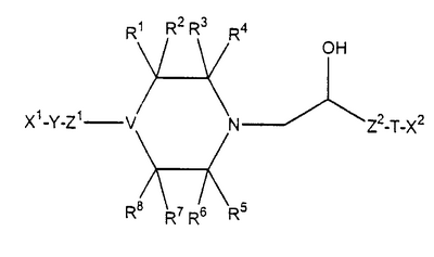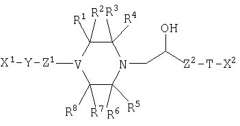 Настоящее изобретение относится к новым гетероциклическим производным, в частности производным пиперазина и пиперидина, и их применению при лечении различных болезненных состояний, в частности сердечно-сосудистых заболеваний, таких как предсердная и вентрикулярная аритмия, перемежающаяся хромота, стенокардия Принцметала (вариант), стабильная и нестабильная стенокардия, стенокардия, вызванная физическими упражнениями, застойная болезнь сердца, ишемия, нарушение перфузии, диабет, инфаркт миокарда, и для повышения уровня HDL (липиды высокой плотности) в плазме при снижении уровня LDL (липиды низкой плотности). Данное изобретение относится также к способам их получения и фармацевтическим композициям, содержащим такие соединения. Известно, что некоторые классы пиперазиновых соединений полезны для лечения сердечно-сосудистых заболеваний, включая аритмию, стенокардию, инфаркт миокарда и родственные заболевания, такие как перемежающаяся хромота. Например, патент США №4567264 раскрывает класс замещенных пиперазиновых соединений, который включает соединение, известное как ранолазин, (±)-N-(2,6-диметилфенил)-4-[2-гидрокси-3-(2-метоксифенокси)пропил]-1-пиперазинацетамид, и его фармацевтически приемлемые соли и их применение при указанных выше болезненных состояниях. Несмотря на требуемые свойства, демонстрируемые ранолазином, который является очень эффективным сердечным терапевтическим агентом и который, как полагают, действует в качестве ингибитора окисления жирных кислот, остается потребность в соединениях, которые имеют терапевтические свойства, аналогичные свойствам ранолизина, но являются более сильнодействующими и имеют больший период полураспада. Задачей данного изобретения является создание новых замещенных пиперазиновых и пиперидиновых соединений, которые являются ингибиторами окисления жирных кислот с хорошим терапевтическим периодом полураспада. Таким образом, первый аспект данного изобретения относится к соединениям формулы I где R1, R2, R3, R4, R5, R6, R7 и R8 представляют водород, низший алкил или -C(O)R; в котором R обозначает -OR9 или -NR9R10, где R9 и R10 обозначают водород или низший алкил; или R1 и R2, R3 и R4, R5 и R6, R7 и R8, взятые вместе с углеродом, к которому они присоединены, представляют карбонил; или R1 и R5, или R1 и R7, или R3 и R5, или R3 и R7, взятые вместе, образуют мостиковую группу -(CR12R13)n-, в которой n равно 1, 2 или 3, и R12 и R13 независимо обозначают водород или низший алкил; при условии, что максимальное количество карбонильных групп равно 2; максимальное количество групп -С(О)NR9R10 равно 1; максимальное количество мостиковых групп равно 1; Т представляет кислород, серу или NR11, в котором R11 представляет водород или низший алкил; V представляет -N<, -CH< или -N-CH<; Х1 представляет водород, необязательно замещенный низший алкил, необязательно замещенный циклоалкил, необязательно замещенный арил или необязательно замещенный гетероарил; Х2 представляет необязательно замещенный арил или необязательно замещенный гетероарил; Y представляет необязательно замещенный моноциклический гетероариленил; Z1 и Z2 независимо представляют замещенный С1-4 алкилен. Второй аспект данного изобретения относится к фармацевтическим препаратам, содержащим терапевтически эффективное количество соединения формулы I и, по меньшей мере, один фармацевтически приемлемый наполн