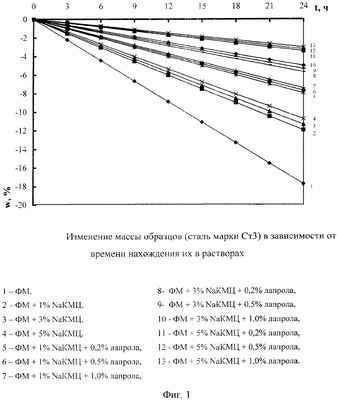 Как видно из графика фиг.1, наибольшую коррозионную активность по отношению к стали проявляет раствор фосфата мочевины (ФМ), наименьшую – раствор фосфата мочевины с 5%-ным содержанием NaКМЦ и 1,0%-ным содержанием лапрола (ФМ+5% NaКМЦ+1,0% лапрола).