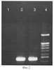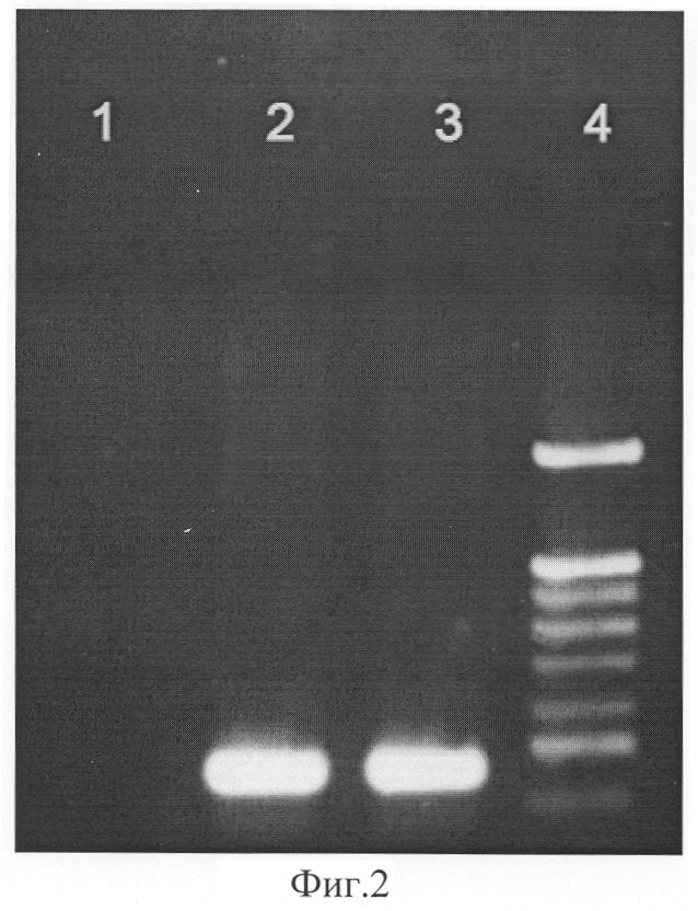 Получение трансгенных растений табака. Полученная по примеру 1 конструкция pC27BN, несущая ген панкреатической секреторной нуклеазы быка, была использована для трансформации клеток Agrobacterium tumefaciens штаммов pGV2260 и AGL0 путем трехродительского скрещивания с использованием плазмиды-помощника pRK2013 или путем прямой трансформации. Для агробактериальной трансформации в качестве исходных эксплантов были использованы листья трехнедельных растений табака Nicotiana tabacum SRI. Были получены 11 первичных трансформантов, устойчивых к канамицину (100 мг/л). Неомицинфосфотрансферазу (NPTII) в проростках тестировали по методу Рейса и соавторов [Reiss В., Sprendel R., Will Н. et al., Gene.1984, v.30, p.211-218]. Далее использовали только растения, устойчивые к канамицину и активно экспрессирующие неомицинфосфотрасферазу II (NPTII). На фиг.2 представлены результаты ПЦР анализа геномной ДНК проростков на наличие полноразмерной встройки целевого гена с праймерами П3-П4. Нанесения по дорожкам: 1 – нетрансгенный табак SR1; 2 – трансгенный табак SR1, экспрессирующий ген панкреатической нуклеазы быка; 3 – вектор pC27BN; 4 – маркерная ДНК.