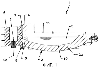 Нижеследующее описание, прежде всего, касается в основном фиг.1 и 2. От дуговой печи 1 показана только нижняя часть кожуха 2 с футерованным подом 3 и ванной 2a. Дуговая печь 1 в обоих направлениях имеет возможность наклона для выпуска расплава или шлака (фиг.1).