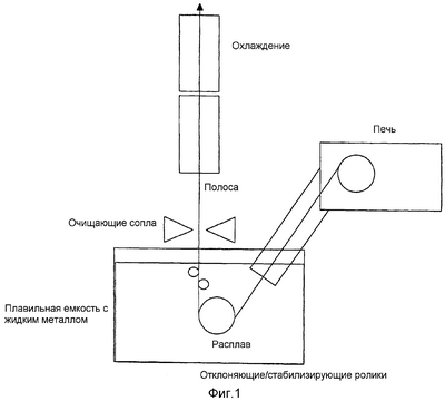 Традиционное нанесение покрытия на полосу горячим способом (называемое способом 1) сплавами Zn, Zn-Al, Al или Al-Si в области нанесения покрытия характеризуется тем, что полоса из нагревательной печи вводится без доступа воздуха в расплав и при помощи различного расположения неприводимых роликов отклоняется в вертикальную плоскость и стабилизируется, как приведено на Фиг.1. Это относится ко всем используемым в качестве покрытия металлам или сплавам при нанесении покрытия погружением в расплав.
