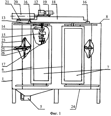 Механизм перемещения детали содержит две неподвижные направляющие 16, расположенные на крышке 8 перпендикулярно оси вращения детали 17, с которыми шарнирно соединена подвижная направляющая 18, на которой с возможностью перемещения установлена плита 19 крепления мотор-редуктора 12, связанная со штоком пневмоцилиндра 20, жестко закрепленным на кронштейне 21 подвижной направляющей 18. В свою очередь, подвижная направляющая 18 соединена со штоками пневмоцилиндров 22, жестко закрепленных на крышке 8.