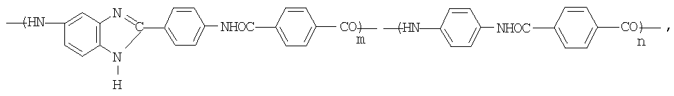 Изобретение касается способа получения высокопрочных высокомодульных нитей на основе ароматических полиамидов с гетероциклами в основной цепи, в частности сополиамидобензимидазолов, обеспечивающего удаление химически связанного с полимером хлористого водорода из волокна. Высокопрочные высокомодульные нейтральные по рН водного экстракта после кипячения нити предназначены для армирования пластиков, резиновых технических изделий, кабелей волоконной оптики, а также для создания бронезащитных (бронежилеты, каски) и других материалов. Нити настоящего изобретения получают на основе СПАБИ, синтезированного исходя из 50-80 мол.% 5(6)-амино-2-(парааминофенил) бензимидазола (далее называемый также гетероциклический диамин или сокращенно ГЦДА), 20-50 мол.% парафенилендиамина (п-ФДА) и 100 мол.% терефталоилхлорида (ТФХ) и, следовательно, он имеет следующую формулу: где m=50-80, n=20-50 и m+n=100. Синтез СПАБИ аналогичного химического строения, формованное изделие (нити) на основе указанного СПАБИ и способ их получения описаны ранее. В патенте РФ 646605 описан способ получения волокнообразующего гетероциклического ароматического полиамида поликонденсацией 50-70 мол.% ГЦДА в смеси с 30-50 мол.% п-ФДА со 100 мол.% хлорангидрида ароматической дикарбоновой кислоты, в том числе с ТФХ, в среде ДМАА (или N-метилпирролидона) в присутствии LiCl или CaCl2. Получают 4,2-4,6%-ные поликонденсационные растворы СПАБИ, которые используют для формования нитей без нейтрализации в них хлористого водорода, побочного продукта синтеза полимера. Формование нити проводят мокрым способом через фильеру на 60 отверстий с диаметром 0,1 мм в осадительную ванну, содержащую 40% ДМАА, 1,5-2,0% хлорида лития или кальция и остальное – вода с пластификационной вытяжкой от 30 до 100%, проводимой на воздухе. Нить, тщательно промытую обессоленной водой и высушенную, термообрабатывают при температуре 350°С в течение 30 минут. Получают готовую нить с прочностью 185-205 сН/текс, относительным удлинением при разрыве 4,1-6,0% и модулем упругости 7200-8700 кгс/мм2. Из патента РФ 2017866, 1994 г. известно формованное изделие (нити, пленки), полученное из СПАБИ, который синтезируют из 70 мол.% ГЦДА, 30 мол.% п-ФДА и 100 мол.% ТФХ в амидном растворителе с солевой добавкой, из поликонденсационного раствора с концентрацией полимера 4,3%, содержащего 2,8% LiCl, 0,97% HCl и ДМАА с вязкостью 54 Па·с и характеристической вязкостью полимера [ Из патента РФ 2143504, 1999 г. известна высокопрочная высокомодульная нить, сформованная сухо-мокрым способом из 4,6%-ного раствора СПАБИ, с [ В патенте РФ 2167961, 2001 г. предлагается получать модифицированные СПАБИ нити мокрым формованием из сополиамида, содержащего звенья 4,4′-диамино-3,3′-дихлордифенилметана. При 5%-ном содержании этих звеньев, т.е. при m=70, n=25, р=5 и m+n+р=100, прочность нитей достигает 230 сН/текс, а относительное разрывное удлинение составляет 3,4%. В этом патенте формование нитей проводят из кислых поликонденсационных растворов, содержащих HCl. Для осадительной ванны используют водно-амидные смеси (ДМАА или N-метилпирролидон) с добавками LiCl или CaCl2. Полученные в осадительной ванне гелеобразные нити с отрицательной фильерной вытяжкой, равной минус 50%, подвергают пластификационной вытяжке на 100%, проводимой на воздухе, после чего их промывают обессоленной водой, сушат при 100-120°С и термообрабатывают. Из патента РФ 2058443 известен прием ще