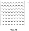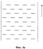 Каждый из надрезов, например, может иметь длину в диапазоне от 0,5 до 30 см. Надрезы, например, могут присутствовать в количестве в диапазоне от 30 до 200 надрезов на м2 слоя непрерывных прядей. Например, можно создать 100 таких надрезов на м2 слоя непрерывных прядей. Фиг.4 демонстрирует вид сверху для слоя непрерывных прядей с нанесенными взаимно параллельными надрезами, направление которых соответствует направлению ширины слоя. На фиг.4а, 4b и 4с продемонстрированы различные конфигурации надрезов. Надрезы могут иметь различные длины для одного и того же слоя непрерывных прядей, как это продемонстрировано на фиг.4с. Стрелки на фигурах указывают направление, в котором слой разматывают.