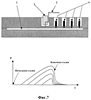 Фиг.7 демонстрирует в верхней части аппарат, который можно использовать для испытания на проницаемость, и в нижней части кривые, которые можно получить при отслеживании изменения давления Р с течением времени Т. Аппарат включает форму 1, подходящую для импрегнирования плоской структуры в результате нагнетания смолы, подаваемой через линию 2 в нагнетательную головку 3. Датчики давления 4 измеряют величины давления в форме.