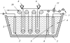 Пример. Ванну 1 из пластиката толщиной 10 мм, длиной 1,5 м, шириной и высотой по 1 м, наполненную водой, с негерметично пригнанной крышкой, находящуюся под вытяжкой, разгораживают на две зоны 2 и 4 объемом 1 м3 и 0,2 м3 соответственно перегородкой 6, обладающей свойством фильтра тонкой очистки воды, – полотном войлочного нетканного материала (основа – шерсть, или полипропилен, или хлорин) толщиной 2 мм, площадью 1 кв. м, в большую по объему зону 2 вводят вдоль внешней боковой стенки плоский графитовый анод 3 площадью 1 кв. м, толщиной 3 мм, в зону 4 – аналогичный по расположению в ванне и по материалу катод 5, заливают ванну водой на 3/4 ее объема, вводят в зону 2 краситель из расчета 30 г/л, дозатором 8 вводят в зону 2 вводят медный купорос из расчета 20 г/л, дозатором 9 в зону 2 вводят порошок монтмориллонита из расчета 5 г/л, талька из расчета 5 г/л загружают приспособлением 10 в анодную зону 2 ванны шерстяную (полиамидную, полипропиленовую, хлориновую) ткань или пряжу, подают на электроды через провода 7 напряжение 100 В, разогревают воду до кипения пропусканием тока через электроды, включают в работу приспособление для машинной стирки белья, крашение проводят в течение 0,5 часа, прокрашенную ткань выгружают из машины приспособлением 10, отжимают волокна приспособлением 11.