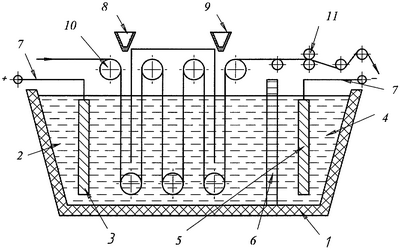 Водяная ванна 1 разгорожена на две зоны, в большую из которых по объему 2 погружен анод 3, в меньшую по объему 4 погружен катод 5, перегородка 6, имеющая свойства фильтра тонкой очистки воды, электроды 3 и 5 предназначены для подачи на них постоянного напряжения величиной 5-220 В по проводам 7, дозатор 8 предназначен для введения в воду анодной зоны ванны солей серной кислоты в количестве 5-30 г/л, дозатор 9 предназначен для введения в воду анодной зоны ванны порошка амфотерных алюмосиликатов: монтмориллонита, каолинита (аноксита), галлуазита, бейделлита, нонтронита, талька, пирофиллита в количестве 1-30 г/л, одного из них, либо в произвольной их смеси, приспособлением 10 осуществляют загрузку и выгрузку волокнистых материалов, приспособлением 11 отжимают волокнистые материалы.
