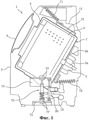 На фиг.1 представлена компоновка основных компонентов стиральной машины 1 барабанного типа, выполненной согласно предпочтительному варианту осуществления настоящего изобретения. Узел 7 с баком для воды включает в себя вращательный барабан 2, бак 3 для воды, вмещающий в себя вращательный барабан 2, и двигатель 5 для приведения в движение барабана, соединенный с вращающимся валом 2а, который расположен в корпусе 6 стиральной машины 1 совместно с приподнятой передней частью узла 7 с баком для воды, при этом вращающийся вал 2а вращательного барабана 2 удерживают посредством опоры 68, расположенной на задней поверхности бака 3 для воды. Поскольку узел 7 с баком для воды имеет тяжелые компоненты, такие как опора 68 вала и приводной двигатель 5 барабана, вблизи его задней поверхности, центр тяжести узла 7 с баком для воды находится вблизи от задней поверхности узла 7. Такая компоновка приводит к неустойчивости узла с баком для воды. Поэтому ниже узла 7 расположен гаситель 70 вибрации, который удерживает узел 7 в том месте, которое находится ближе к передней стороне, чем центр тяжести узла 7. Кроме того, между верхней опорной частью 75, закрепленной на верхней части бака 3 для воды, и верхней стороной корпуса 6 установлена первая цилиндрическая пружина 71, так что узел 7 с баком для воды смещен к верхней передней части корпуса 6. Далее, дополнительно к первой цилиндрической пружине 71 имеется вторая цилиндрическая пружина 72, установленная между задней стороной корпуса 6 и нижней задней поверхностью узла 7 с баком для воды, при этом место установки второй цилиндрической пружины 72 на нижней задней поверхности узла 7 находится на более низком уровне, чем место удерживания узла 7 с баком для воды посредством гасителя 70 вибрации. Посредством первой и второй цилиндрических пружин 71 и 72 может быть предотвращена тенденция к отпаданию узла 7 с баком для воды к задней стороне, при этом будет образована конструкция, эффективная в отношении гашения вибрации.