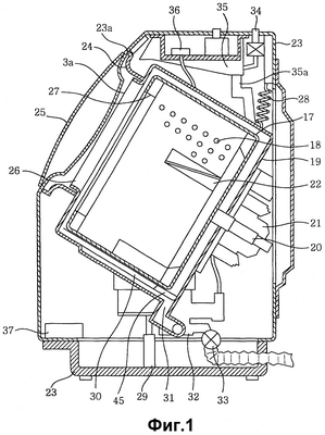 Далее следует описание первого предпочтительного варианта реализации изобретения. На фиг.1 показан вид сбоку в разрезе стиральной машины барабанного типа согласно первому предпочтительному варианту реализации настоящего изобретения. Как показано на фигуре, цилиндрический вращающийся барабан 17 с донной поверхностью снабжен множеством отверстий 18 на своей цилиндрической поверхности и установлен с возможностью вращения в баке 19 для воды. Кроме того, вращающийся барабан 17 снабжен также вращающимся валом (центральная ось вращения) 20 в своем центре вращения, и размещается так, что его центральная ось вращения наклонена от передней стороны стиральной машины барабанного типа к ее задней стороне. Далее, двигатель 21, установленный в задней части бака 19 для воды, соединяется с вращающимся валом 20, так что двигатель 21 осуществляет привод вращающегося барабана 17 с его вращением по часовой или против часовой стрелки. Кроме того, на внутренней цилиндрической поверхности вращающегося барабана 17 размещаются лопасти 22 для перемешивания.