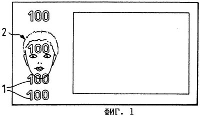 На фиг.1 показана банкнота, имеющая несколько двухступенчатых водяных знаков 1 в виде соответствующих ее номиналу цифр “100” и один многоступенчатый водяной знак 2 в виде портретного изображения. Отдельные двухступенчатые водяные знаки 1 частично или полностью накладываются на многоступенчатый водяной знак 2. Бумагу для такой банкноты из-за наличия у нее многоступенчатого водяного знака изготавливают на круглосеточной бумагоделательной машине с рельефной сеткой, предназначенной для создания водяного знака 2 в виде портретного изображения.