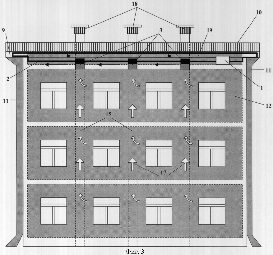 На Фиг.3 показана антиобледенительная замкнутая гидравлическая система жилых и офисных зданий, состоящая из газожидкостного теплообменных аппаратов, насоса и системы пластиковых труб, заполненных незамерзающим теплоносителем, функционирующая на основе теплого воздуха помещений.