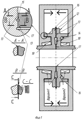 Устройство осевого уплотнения содержит лопастные роторы, закрепленные на двух соприкасающихся дисках 12 (Фиг.1), размещенных в центре камеры, которая выполнена с возможностью сужения в осевом направлении (сходящиеся стрелки), на каждом диске жестко крепится втулка 16, составляющая половину внутреннего цилиндра рабочей камеры, диски 12 соприкасаются между собой, а втулки – с корпусом боковыми поверхностями, на которых имеются насечки (зубцы, канавки) 13 (см. сечение А-А, В-В, С-С), поверхности подвергаются механической обработке, и диски садятся на радиально-упорные 18 и/или осевые 14 подшипники, расположенные между корпусом и втулками и между дисками. (Для варианта 2 возможно наличие упорных 18 подшипников.)