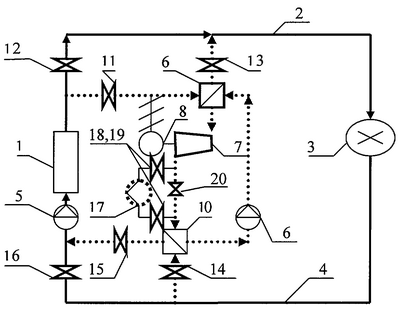 Горячая вода из водогрейного котла 1 поступает на парогенератор 6 низкокипящего рабочего тела при открытых задвижках 11 и 13, задвижка 12 при этом закрыта. Возможен режим работы установки с частично открытой задвижкой 12. В парогенераторе 6 осуществляется частичный отбор теплоты на генерацию пара НКРТ. После парогенератора 6 вода поступает по магистральным теплосетям к тепловым потребителям 5, где и происходит основной отбор теплоты от первичного теплоносителя сетевой воды. Обратная сетевая вода после потребителей 5 возвращается на водогрейный котел 1, причем предварительно она через задвижки 14 и 15 (задвижка 16 – закрыта) поступает на частичный подогрев в конденсатор-подогреватель 10, в котором низкопотенциальная теплота отводится от низкокипящего рабочего тела и передается обратной сетевой воде. В результате вода частично подогревается и только после частичного нагрева в конденсаторе-подогревателе она поступает на окончательный догрев в водогрейный котел 1.
