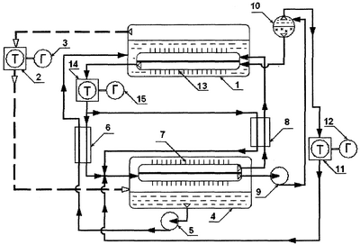 Номером (1) обозначен котел, в котором происходит кипение рабочего тела, участвующего в работе по циклу Ренкина. Номером (2) обозначена турбина, на которой рабочее тело совершает полезную работу и которая приводит генератор (3). После чего рабочее тело подают в конденсатор (4). Превратившись в жидкость, рабочее тело через теплообменник (6), где его подогревают, снова подают в котел (1). Таким образом замыкают цикл Ренкина. Источником тепла в котле (1) выступает мембранный блок (13), в котором происходит растворение растворимого вещества с выделением тепла, причем благодаря прямому осмосу через мембрану этого блока на высоконапорную сторону происходит перекачка большого количества растворителя, после чего горячий ненасыщенный раствор подают к турбине (14), приводящей генератор (15). Часть прошедшего турбину (14) раствора через теплообменник (6), где его охлаждают до состояния, близкого к насыщенному, и подают в мембранный блок (7), другую часть этого же раствора подают через теплообменник (8), где его охлаждают до состояния, близкого к насыщенному, тоже в мембранный блок (7). В мембранном блоке (7) через мембрану, работающую по принципу обратного осмоса, при низкой температуре отделяют растворитель. В результате перед мембраной происходит нарушение равновесия раствора и растворенное вещество выпадает в осадок с поглощением тепла. Полученный концентрированный раствор с большим содержанием осадка растворяемого вещества подают насосом (9) в устройство-сепаратор (10), отделенную в сепараторе жидкость – растворитель через гидротурбину (11), приводящую генератор (12), подают к мембранному блоку (7). Осадок растворяемого вещества из сепаратора (10) подают в мембранный блок (13) на высоконапорную сторону для растворения при высокой температуре. Отделенный в мембранном блоке (7) растворитель через теплообменник (8), где его подогревают, подают в мембранный блок (13) на низконапорную сторону, где он через мембрану под действием осмотического давления попадает на высоконапорную сторону. Таким образом, цикл замыкают. Причем точку подвода тепловой энергии от внешнего источника выбирают ориентируясь по теплоемкостям и иным термодинамическим качествам участвующих веществ и их растворов. Возможна реализация, в которой мембранный блок (13) заменяется простой камерой смешения, но эта реализация менее выгодна энергетически.