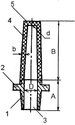 1. Глушитель шума, содержащий впускной патрубок и жестко связанный с ним корпус из пористого материала, отличающийся тем, что корпус выполнен из пористого материала в виде обечайки усеченного конуса, большее основание которого посредством резьбового соединения связано с торцом впускного патрубка, а меньшее выполнено в виде сплошного диска, пористость которого меньше пористости обечайки усеченного конуса, причем отношение высоты корпуса В к диаметру D впускного патрубка находится в диапазоне оптимальных величин: B/D=3,0…5,0, а отношение диаметра D большего основания обечайки усеченного конуса к диаметру d меньшего основания находится в диапазоне оптимальных величин: D/d=3,0…5,5, а отношение толщины b пористого материала обечайки к высоте корпуса В находится в диапазоне оптимальных величин: b/В=0,05…0,2.