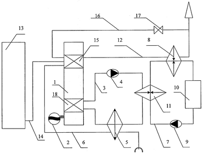 При работе двигатель Стирлинга 1 производит полезную энергию, преобразуемую в электрическую энергию с помощью электрогенератора 2, расположенного на одном валу с двигателем 1. Для охлаждения двигателя 1 в холодильник 18 из системы охлаждения 3 подается охлаждающая жидкость. Охладив двигатель 1, нагретая охлаждающая жидкость из холодильника 18 с помощью насоса 4 поступает в теплообменник подогрева 11, где передает часть теплоты теплоносителю системы внешнего теплоснабжения 7. Затем охлаждающая жидкость поступает в теплообменник-охладитель 5, где охлаждается до температуры окружающей среды за счет теплообмена с воздухом, поступающим по магистрали подачи воздуха 6, и возвращается в холодильник 18.