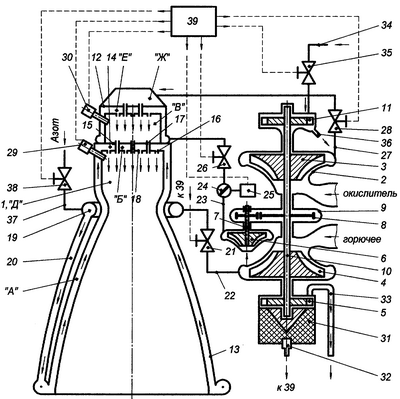 Жидкостный ракетный двигатель содержит камеру сгорания 1 и турбонасосный агрегат 2 – ТНА. Турбонасосный агрегат 2, в свою очередь, содержит насос окислителя 3, насос горючего 4, пусковую турбину 5, дополнительный насос горючего 6, вал которого 7 соединен мультипликатором 8, размещенным в корпусе мультипликатора 9 с валом 10 турбонасосного агрегата 2, основную турбину 11, выполненную в верхней части турбонасосного агрегата 2. Газогенератор 12 установлен над камерой сгорания 1 соосно с ней. Камера сгорания 1 содержит сопло 13, выполненное из двух оболочек и зазором “А” между ними, и головку камеры сгорания 14, внутри которой выполнены наружная плита 15 и внутренняя плита 16 с полостью “Б” между ними. Внутри головки камеры сгорания 14 установлены форсунки окислителя 17 и форсунки горючего 18. Форсунки окислителя 17 сообщают полость “В” с внутренней полостью “Д” камеры сгорания 1, а форсунки горючего 18 сообщают полость “Б” с внутренней полостью “Д” камеры сгорания 1. На наружной поверхности камеры сгорания 1 установлен коллектор горючего 19, от которого отходят топливопроводы 20 к нижней части сопла 13. К коллектору горючего 19 подключен выход из клапана горючего 21, вход которого трубопроводом 22 соединен с выходом из насоса горючего 4. Выход из насоса горючего 4 также соединен со входом в дополнительный насос горючего 6, выход из которого трубопроводом высокого давления 23 через регулятор расхода 24, выполненный с приводом 25, и клапан высокого давления 26 соединен с газогенератором 2, конкретно – с полостью “Е”. Выход из насоса окислителя 3 трубопроводом окислителя 27 через клапан окислителя 28 тоже соединен с газогенератором 12, конкретно с его полостью “Ж”. На головке 14 камеры сгорания 1 установлены запальные устройства 29 (электрозапальные или пирозапальные), а на газогенераторе – запальные устройства 30. Запальных устройств может быть применено по одному или по несколько штук и на камере сгорания 1, и на газогенераторе 12. К пусковой турбине 5 подстыкована пиротехническая шашка 31 с запальником 32 и выхлопная труба 33. К основной турбине 11 подключен трубопровод подачи воздуха высокого давления 34 с клапаном 35 и трубопровод сброса 36. К коллектору горючего 19 подсоединен трубопровод продувки 37 с клапаном 38. Жидкостный ракетный двигатель имеет блок управления 39. Блок управления 39 соединен электрическими связями с запальными устройствами 29 и 30, клапаном горючего 21, клапаном окислителя 28, приводом регулятора расхода 25, клапаном высокого давления 26, запальником 32. При запуске ЖРД с блока управления 39 подаются электрические сигналы на запальник 32. Твердое топливо пиротехнической шашки 31 воспляменяется, и продукты его сгорания подаются на пусковую турбину 5 и раскручивают ТНА 2. Давление окислителя и горючего на выходе из насосов окислителя 3, насоса горючего 4 и дополнительного насоса горючего 6 возрастает. Подается сигнал на открытие клапанов 21, 26 и 28. Окислитель и горючее поступают в камеру сгорания 1 и газогенератор 12. Подается сигнал на запальные устройства 29 и 30, топливная смесь в камере сгорания 1 и в газогенераторе 12 воспламеняется. Двигатель запустился. Регулятором расхода 24 осуществляют регулирование режима его работы путем изменения соотношения компонентов топлива в газогенераторе 12.