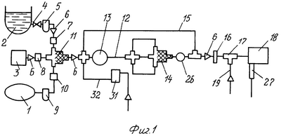 Штатный топливный насос 13 при открытых вентиле 4 и электромагнитном клапане 30 прокачивает смешиваемые компоненты из топливного бака 1, емкости с водой 2, емкости с присадками 3 и через водяной фильтр 5, обратные клапаны 6, топливный фильтр 9, дозаторы 7, 8, 10 и первый эмульгатор 11, откуда первоначальная эмульсия поступает в основной топливопровод 12 подачи топливно-водной эмульсии. Полученная первичная эмульсия закачивается во второй эмульгатор 14, снабженный системой циркуляции 15, где происходит окончательное эмульгирование с одновременной подачей эмульсии через электромагнитный клапан 16 в штатную топливную систему 18. В зависимости от расхода изменяется скорость циркуляции многокомпонентной топливной смеси.