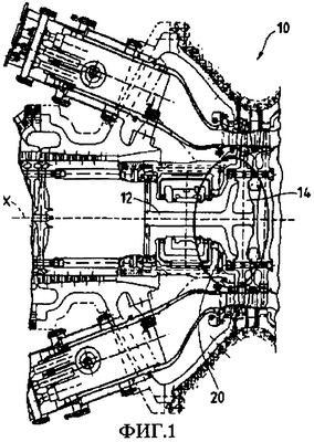 На фиг.1 показана газовая турбина, обозначенная в целом номером 10, в которой вращающийся вал 12 осевого компрессора, вращающийся вокруг оси Х турбины, соединен с узлом 14 диска ротора ступени высокого давления при помощи соединительного фланца 20, выполненного согласно известному уровню техники.