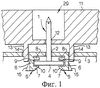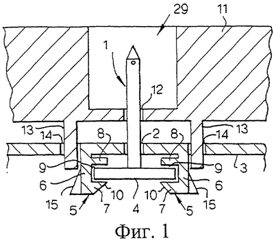 Как описано выше со ссылкой на фиг.1, полые шипы 1 удерживаются на месте опорами 29. Таким образом, тело 31 шипа проходит через совмещенные отверстия в верхней пластине 3 и верхней крышке 11 и прочно закрепляется на месте за счет взаимодействия кольцевой удерживающей пластины 32 со щелью 9, ограниченной первым и вторым буртиками 7, 8 фиксаторов 5. Удерживание пластинки 32 в щели 9 происходит за счет поддерживающего действия стягивающих элементов 13, расположенных снаружи стенок 6 фиксаторов 5, которые по существу предотвращают изгиб стенок 6 наружу.