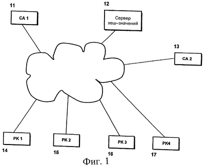 На фиг.1 показана типичная система с открытым ключом согласно первому аспекту настоящего изобретения. Система включает первый 11 и второй 13 серверы удостоверяющего центра, сервер 12 хеш-значений, а также клиентские терминалы 14-17. Серверы 11-13 и клиенты 14-17 связаны с сетью общего пользования, например с Интернетом. Сервер 11, 13 удостоверяющего центра отвечает за общее использование одного или нескольких таких центров в системах с открытым ключом, имеющих инфраструктуры с открытым ключом. Согласно настоящему изобретению, использование удостоверяющего центра в пределах системы хотя и поддерживается, но не требуется для безопасной доставки цифровых данных, например открытых ключей, как описано ниже. Кроме того, сервер хеш-значений или удостоверяющий центр могут также быть эмулированы распределенной одноранговой системой, например сформированной клиентскими терминалами 14-17 или их подмножеством. Соответствующий открытый ключ РК1-РК4 существует для каждого из клиентских терминалов 14-17 или для соответствующих пользователей клиентских терминалов 14-17.