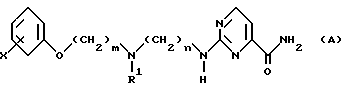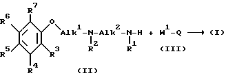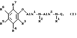 Настоящее изобретение относится к новым замещенным производным арилоксиалкилдиамина, способам их получения, фармацевтическим композициям, содержащим их, и их использованию в качестве лекарственного средства, в частности для профилактики или лечения нарушений, характеризующихся избыточным расширением сосудов, в частности мигрени. Мигрень – несмертельное заболевание, которым страдает каждый десятый человек. Основным симптомом является головная боль, другие симптомы включают рвоту и светобоязнь. В течение многих лет наиболее широко используемое лечение мигрени включало назначение эрготалкалоидов, которые давали некоторые неприятные побочные явления. Недавно в качестве нового препарата против мигрени стали применять производное триптамина, т.е. суматриптан. Неожиданно найдено, что данные новые замещенные производные арилоксиалкил диамина проявляют 5-HT1-подобную агонистическую активность и, таким образом, могут применяться в лечении нарушений, характеризующихся избыточным расширением сосудов, особенно мигрени. Arzneimittel. Forschung, 25, 1404 /1975/ раскрывает некоторые производные гуанидина и амидина, среди которых N-[2-[2-/2-метоксифенокси/этиламино] этил] гуанидин и которые обладают активностью инактивации – норадреналина. EP-0511 0,72 раскрывает производные 2-аминопиримидин-4-карбоксамида с общей формулой /A/ как антагонисты 1– адренергических рецепторов.