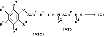 Соединения формулы /I/ можно также получить алкилированием амина формулы /VI/ промежуточным соединением формулы /VII/, в котором W2 реактивная уходящая группа, такая, как галоген: хлор, бром или йод; сульфонилокси: метансульфонилокси, метилбензолсульфонилокси и другие, в подходящих растворителях, таких, как кетоны: 2-бутанон и пр.; эфиры: ТГФ; ароматические углеводороды: метилбензол и др. ; биполярные апротонные растворители: ДМФ, диметилацетамид, диметилсульфоксид и др.