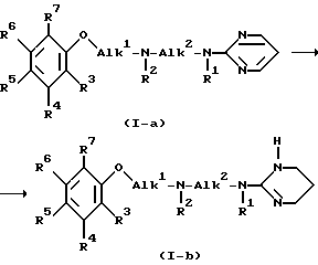 Пример 7a/ Смесь промежуточного соединения 3 /0,117 М/ и 2-пиримидинил-1,3-пропандиамина /0,087 М/ в этаноле /500 мл/ перемешивают 45 минут при 20oC. Реакционную смесь охлаждают до 0oC /баня с ледяной солью/. Одной порцией добавляют боргидрид натрия /0,125 М/ и реакционную смесь перемешивают 2 часа. Добавляют воду и растворитель выпаривают. Остаток разделяют между 1,1-оксибисэтаном и водой. Органический слой отделяют, высушивают, фильтруют и растворитель выпаривают. Остаток очищают колонной хроматографией на силикагеле /элюент: CH2Cl2/CH3OH/NH3/ 95/5. Чистые фракции собирают и растворитель выпаривают. Остаток кристаллизуют из 2-пропанола. Осадок отфильтровывают и высушивают с получением 7,7 г /23,4%/ N-[2-[2-/фенилметокси/фенокси]этил] -N’-2-пиримидинил-1,3- пропандиамина. Т.пл. 90,1oC /соед. 3/.
