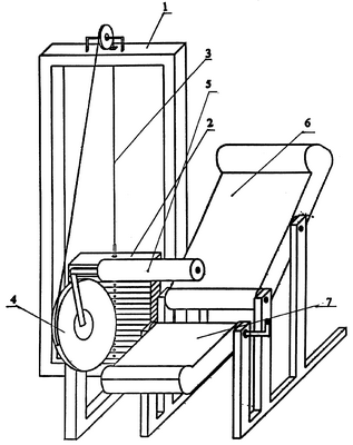 Вид базового варианта тренажера представлен на чертеже, при этом использованы следующие обозначения: вертикальная рама 1, средство 2 создания нагрузки, трос 3, шкив 4, установленный на вертикальной раме 1, средство 5 для размещения ноги, участок 6 скамьи для размещения спины и головы, участок 7 скамьи для размещения ягодицы.