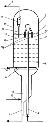 Испаренные парафиновые углеводороды (сырье) подаются в реактор по трубопроводу и патрубку 4 через распределитель 6. В отпарную зону 11 по трубопроводу 12 подается инертный газ на отпарку от углеводородов отходящего из реактора катализатора. В нижней части реактора (между распределителем и нижней решеткой) пары сырья смешиваются с поднимающимися из отпарной зоны газами отпарки и далее поднимаются по кипящему слою катализатора, проходя последовательно секционирующие решетки, попадая затем в сепарационную зону 13. Уловленный в циклонах 14 и охлажденный в сепарационной зоне катализатор возвращается по стоякам 15 через выпускные торцы 18 в высокотемпературную часть кипящего слоя над верхней секционирующей решеткой 9.
