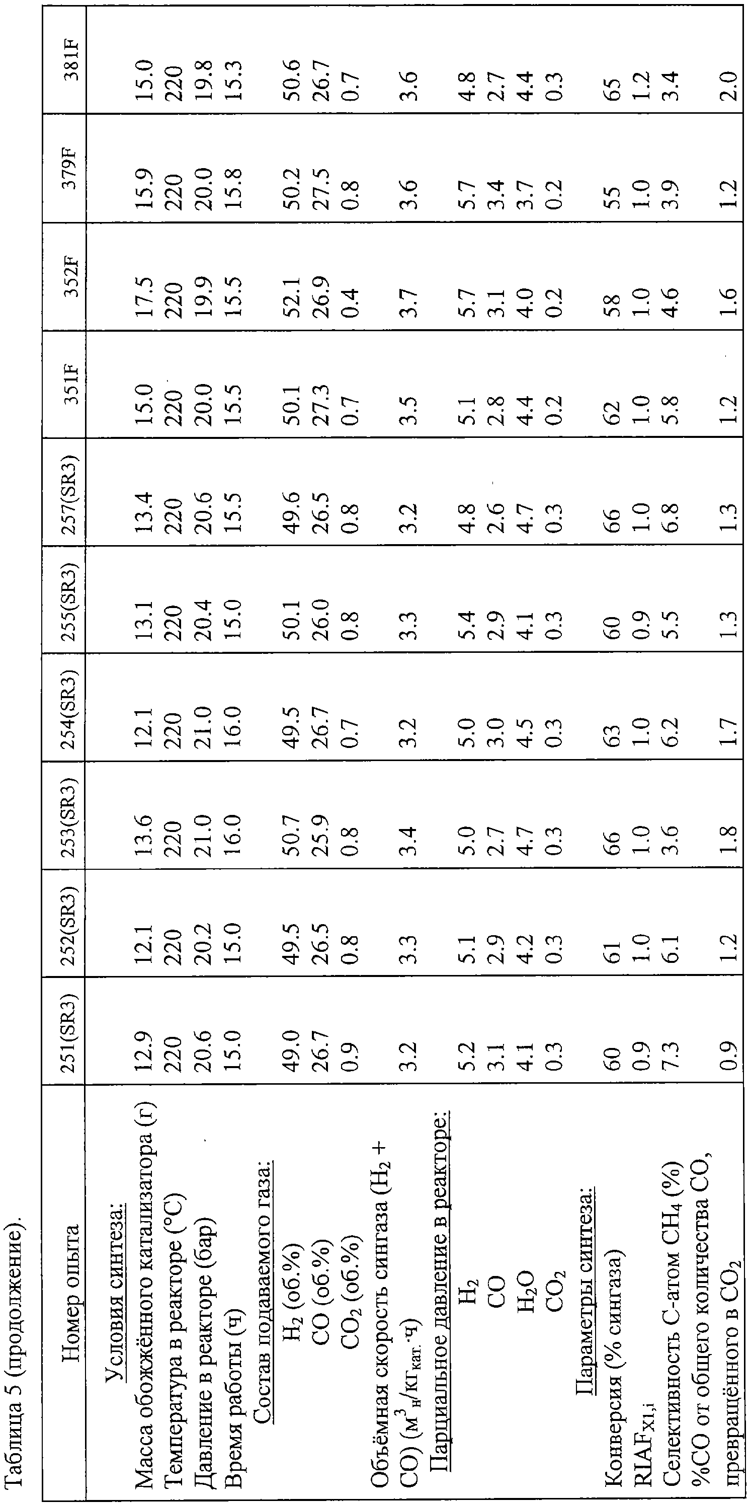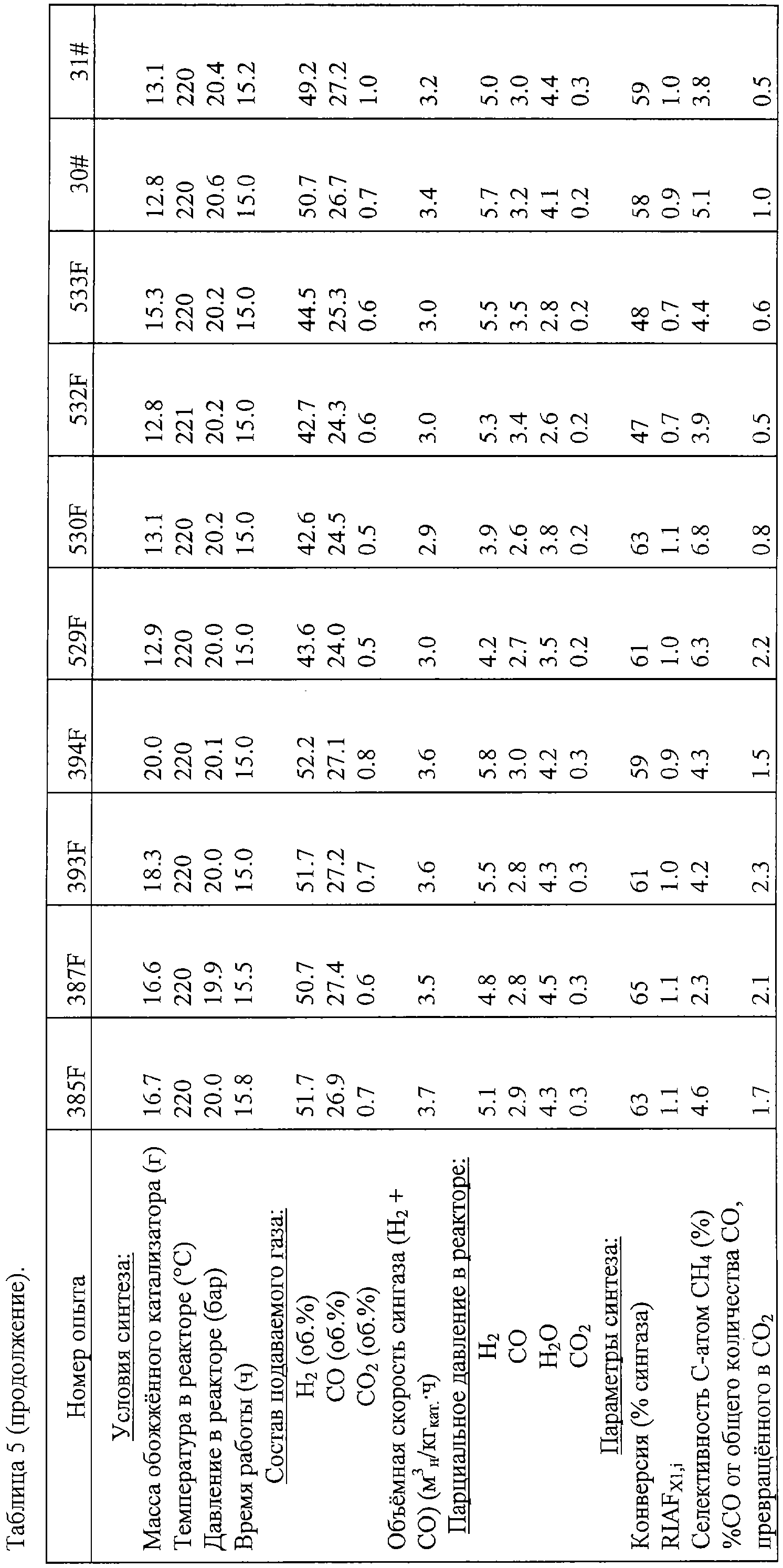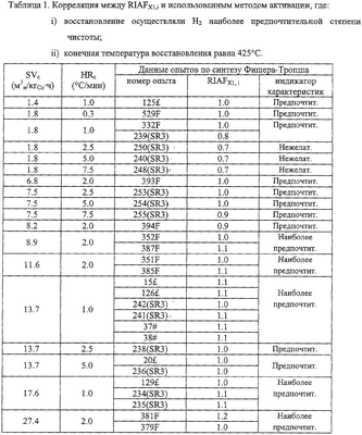 После проведения этих опытов в суспензии в CSTR Фишера-Тропша определяли соответствующие RIAFX1,i, что показано в Таблице 5 и коррелировали с методами активации, показанными в Таблице 1 и Таблице 2 и на Фиг.2 и Фиг.3.