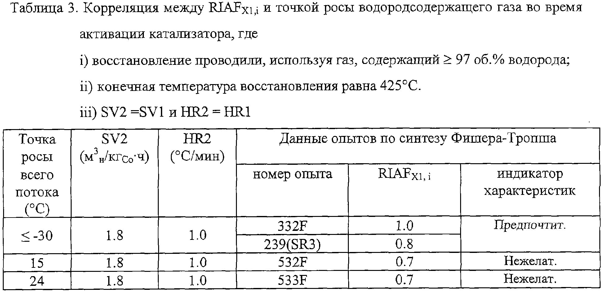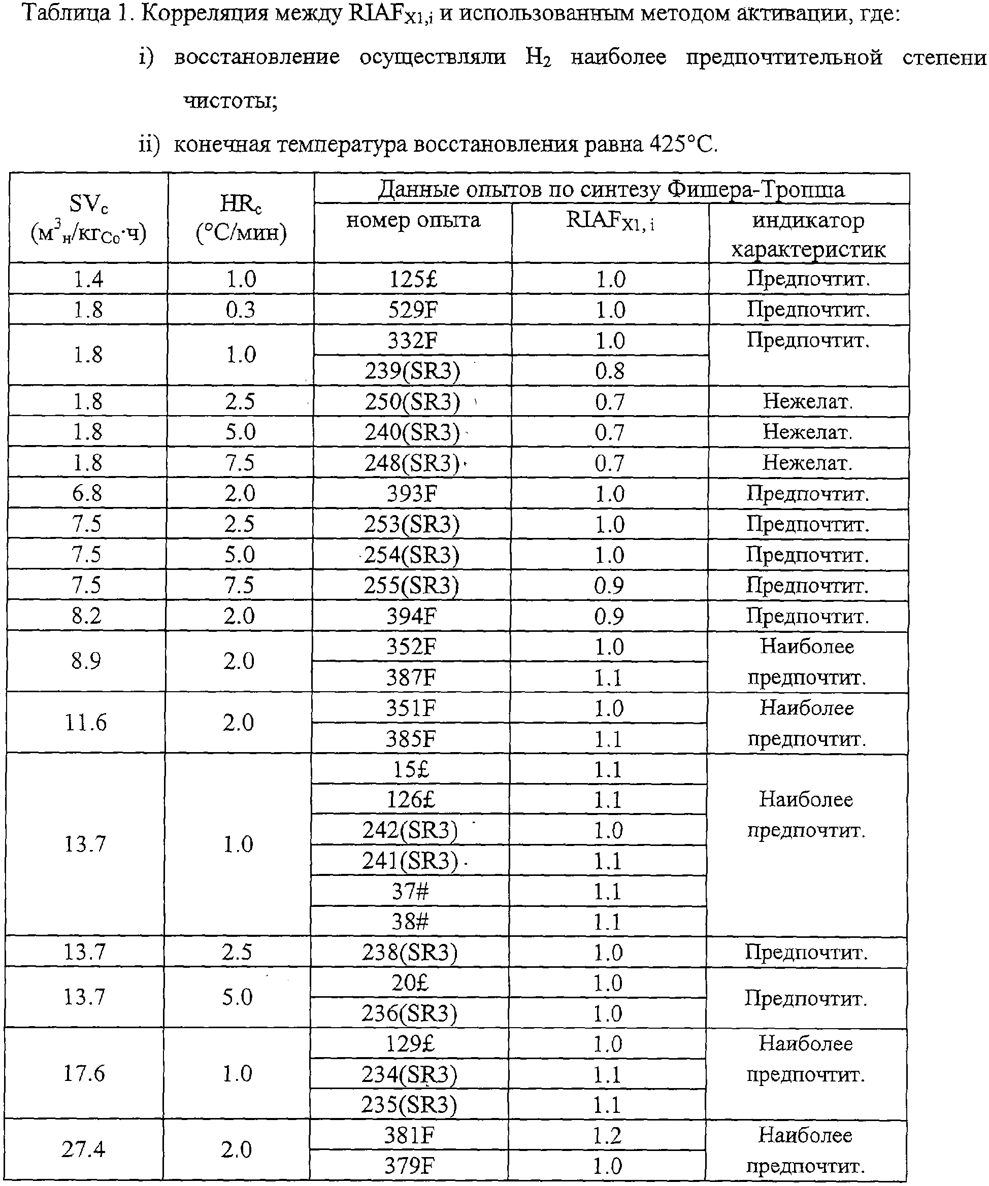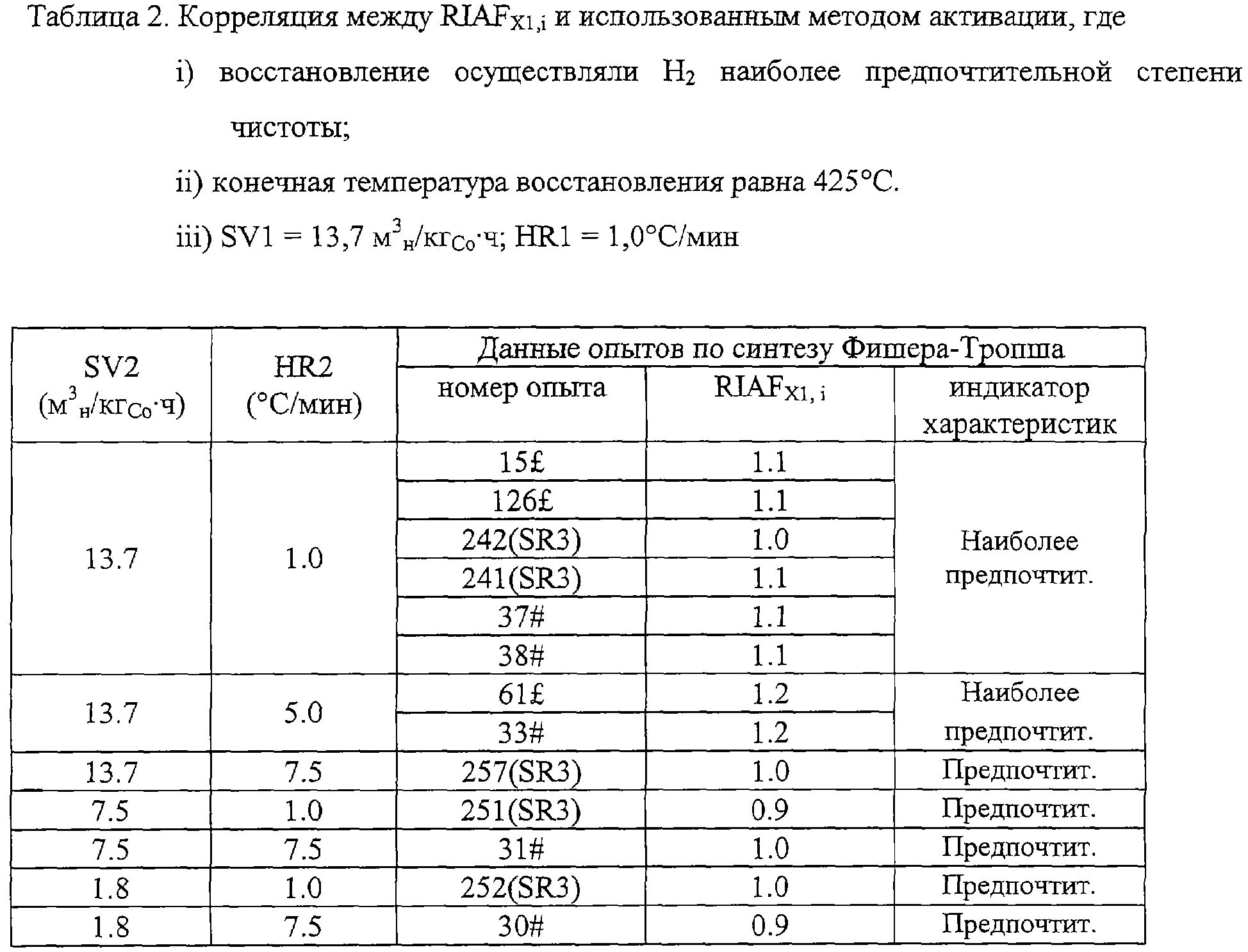 Если восстановление проводят в псевдоожиженном слое, тогда количественное определение минимально допустимой SV1 (то есть SV1min) и максимально допустимой SV1 (то есть SV1max) диктуется условием надлежащего псевдоожижения в течение всей первой стадии активации катализатора. Таким образом, SV1min; а также SV1>SV1max не входят в интервал, то есть не являются применимыми. То же самое условие надлежащего псевдоожижения применимо и ко всей второй стадии активации, что также предполагает существование минимально допустимой SV2 (то есть SV2min) и максимально допустимой SV2 (то есть SV2max). Надлежащее псевдоожижение зависит от конфигурации реактора и свойств катализатора. Предпочтительные режимы псевдоожижения представляют собой турбулентный, взбалтывающий и барботирующий – снарядный режимы, при этом турбулентный и взбалтывающий режимы являются предпочтительными, а взбалтывающий – наиболее предпочтительным (см. Design Manual of the Particulate Solid Research Institute (PRSI), USA, September, 1993). Специалист в данной области, используя PRSI Design Manual и выбранные конфигурацию реактора и свойства катализатора, может таким образом определить соответствующие величины для SV1min, SV1max, SV2min и SV2max, которые обеспечат нужный режим псевдоожижения. Кроме того, SV2 SV2 (где SV2 является минимальной из SV1 и SV2max) и HR2 HR1. С этими ограничениями можно рассмотреть различные комбинации SV2 и HR2 и оценить их влияние на RIAFx,i. На основе предположения, что: