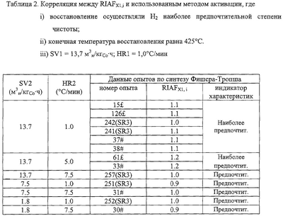 Этот вариант первого аспекта изобретения относится к ситуации, когда желательно фиксировать поверхностную скорость газа во время стадии 1 активации и/или стадии 2 активации, все еще получая катализатор RIAFx,i 0,8. Поверхностная или линейная скорость представляет собой объемную скорость течения (при температуре и давлении в реакторе) газа на единицу площади поперечного сечения реактора для восстановления. Для превращения линейной (поверхностной) скорости в SV (SV1t; SV2t) требуется корректировка температуры, давления, площади поперечного сечения и массы способного к восстановлению кобальта.