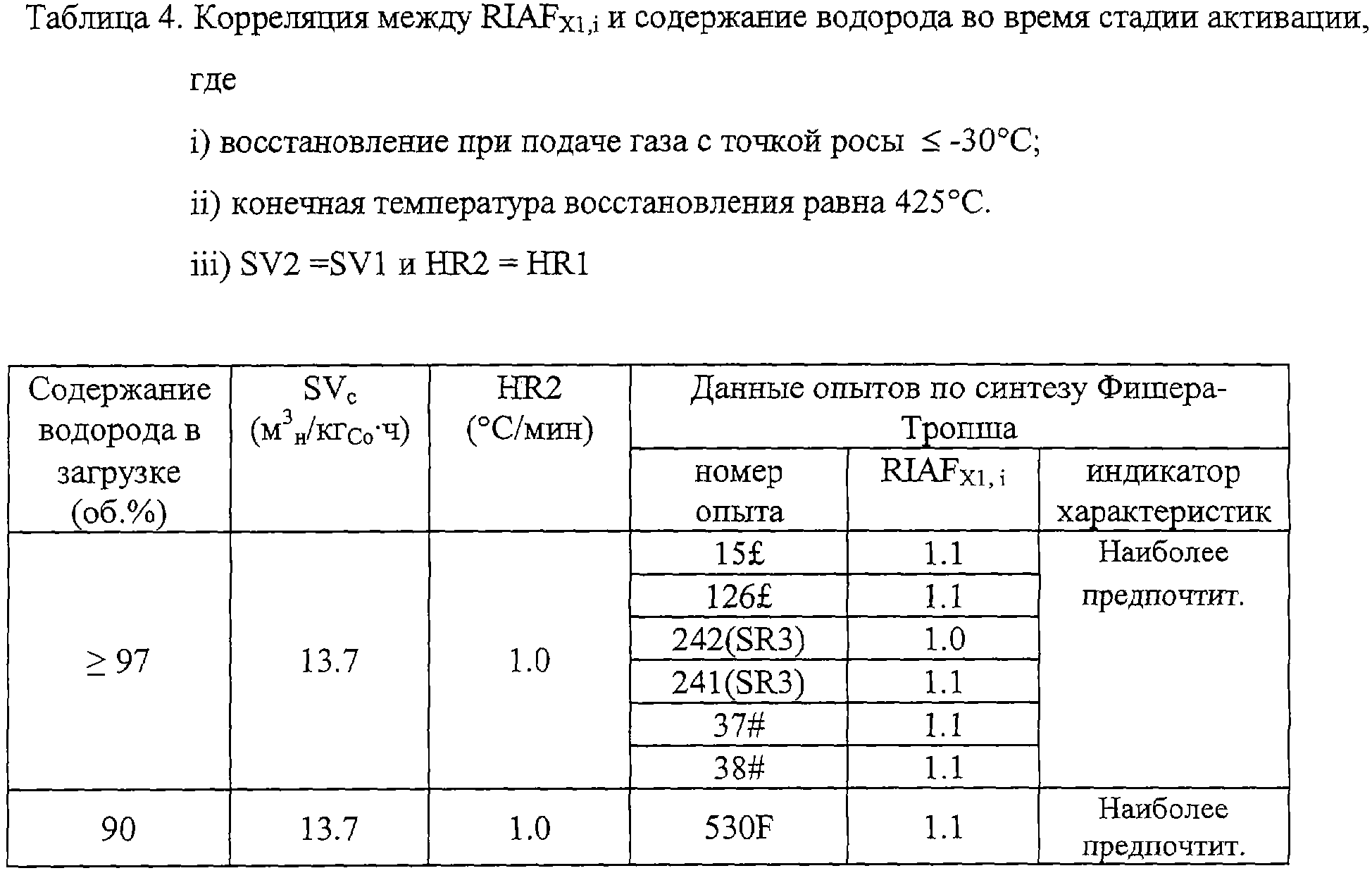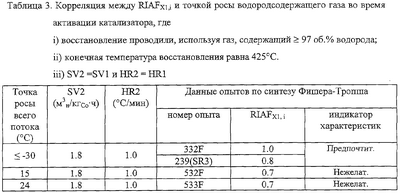 Предшественники кобальтсодержащего катализатора по Примеру 1 восстанавливали в потоке газа с определенным содержанием водорода, как показано в Таблице 4, и использовали при проведении синтеза Фишера-Тропша, описанного в Примере 3. По результатам этих опытов подсчитывали соответствующие RIAFX1,i, как показано в Таблице 5.