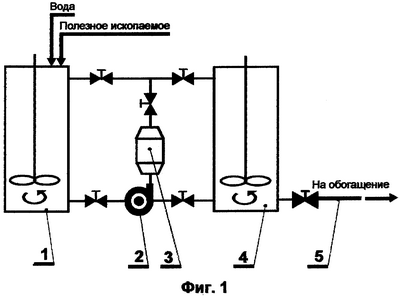 Предлагаемый способ (фиг.1) реализуют с помощью предлагаемого кавитационного диспергатора следующим образом. Дозированные составляющие суспензии полезного ископаемого подают в репульпатор 1 и далее насосом 2 в указанный диспергатор 3, в котором происходит измельчение частиц полезного ископаемого в суспензии по естественным дефектам и вскрытие зерен полезных компонентов из сростков резонансным воздействием гидроударных и кавитационных импульсов по зонам естественной спайки этих зерен с породой. Обработанную суспензию подают в емкость 4, а далее по трубопроводу 5 на обогащение (например, на флотацию).