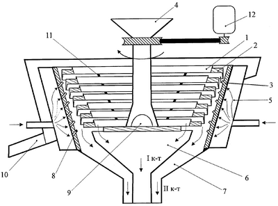 Классификатор состоит из внутренней чаши 1 со специальным рифлением 2, щелей на рифлях 3, вала привода, выполняющего роль загрузочного патрубка 4 выполненной в виде цилиндрической трубы с расширением на нижней части. В нижней части трубы имеются отверстия для выхода материала 9, корпус с ватержакетом 5, разгрузочный патрубок грубого концентрата 6, разгрузочный кольцевого кармана для мелкого концентрата 7, сопла для подачи воды 8, разгрузочного устройства хвостов 10, узла крепления 11, электродвигатель 12.