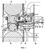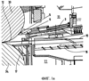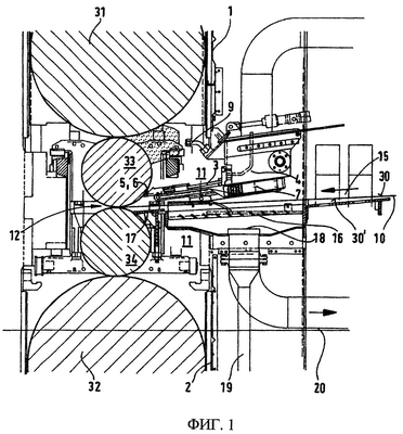 Над полосой 10 этим дополнением является верхний, выполненный перемещаемым отклонитель 3 полосы, который содержит встроенное, работающее от вентилятора приспособление 4 для обдува полосы с соплом 7 низкого давления. Это приспособление 4 для обдува полосы удлинено вверх к верхнему рабочему валку 33 щелевым соплом 6 до приспособления 5 для герметизации зазора бочки валка и вплотную подходит к рабочему валку 33. Благодаря специальному выполнению щелевого сопла 6 происходит герметизация оставшегося зазора между рабочим валком 33 и щелевым соплом 6 с использованием эффекта флотации. Этот эффект сказывается таким образом, что выходящая из щелевого сопла 6 воздушная струя повторяет кривизну расположенной непосредственно за щелевым соплом 6 криволинейной поверхности рабочего валка 33 и тем самым оттесняет назад приставшие к поверхности валка жидкие среды. В частности, на фиг. 1а в увеличенном виде хорошо различимо это щелевое сопло 6 приспособления 5 для герметизации зазора бочки валка.