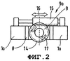 На Фиг.2 показана плоскость запирающего привода 9a. Между находящимися по обе стороны подвижными балками 1a установлен с возможностью вращения поворотный фланец 14 привода 9a запирания, который может поворачиваться в обе стороны. При этом вращательное движение осуществляется, например, с помощью работающего на гидравлическом, электрическом и/или механическом принципе прямоточного приводного механизма 15, так что из линейного движения 16 возникает вращательное движение 17 в соответствующем, показанном стрелкой, направлении. Находящаяся под приводом 9а запирания на одной с ним оси затягивающая шайба 12 (Фиг.3) в показанном положении открыта, причем запирающая шайба 12 направлена продольной формой 12a вверх. Фиксирующий блок 8 поэтому свободен по оси, и валок 11, например промежуточный валок, может быть выдвинут по оси к обслуживаемой стороне с целью замены.