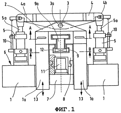 Согласно Фиг.1 у станины 1 прокатной клети 6 в окне клети с двух сторон предусмотрены подвижные балки 1a для подушки 7, которые через соединительную балку 2 опираются на станину прокатной клети. Соединительные балки 2 шарнирно соединены по центру с главной балкой 4 в шарнирной опоре 3 с помощью соединительного болта 3a. Разделение на главную балку 4 и соединительную балку 2 предотвращает перекос, который мог бы произойти из-за неодинакового управления блоками поршневых цилиндров 5. К концам 4a и 4b главной балки 4 шарнирно присоединены шатуны 5a блока поршневых цилиндров 5. Как только начнет происходить смещение, каждый блок поршневых цилиндров 5 будет управляться с помощью датчика перемещений 10 в зависимости от условий движения.