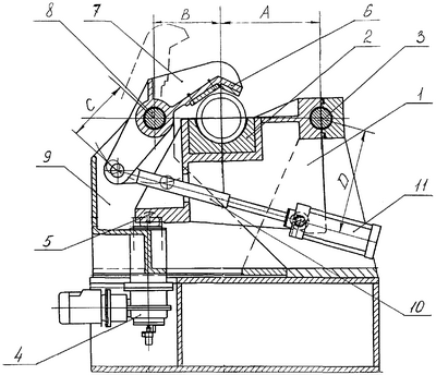 В процессе прокатки гидроцилиндр 11 находится под постоянным давлением. Шток 10 выдвинут в крайнее положение и играет роль тяги, связывающей поворотный корпус 1 с рычагом 7. При необходимости извлечения проката из желоба 2 в штоковую полость гидроцилиндра 11 подают давление, при этом шток 10 перемещается и поворачивает рычаг 7, открывая желоб для возможности выброса заготовки (показано пунктиром).