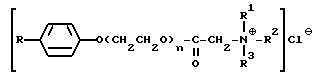 ![]() где R – алифатический прямоцепочечный или разветвленный углеводородный радикал, содержащий 8 – 10 атомов углерода; R1, R2 – CH3, или алифатический углеводородный радикал, содержащий 5 – 10 атомов углерода; R3 – алифатический углеводородный радикал, содержащий 5 – 22 атомов углерода; n – степень оксиэтилирования, равная 3 – 15; при следующем соотношении компонентов, мас.%: Глутаровый альдегид – 20,0 – 26,0 N -[алкилфеноксиполи(этиленокси)карбонилметил] аммоний хлориды или их смеси – 4,0 – 20,0 Вода – До 100 2. Способ получения дезинфицирующего средства путем нагревания, отличающийся тем, что нагревают смесь водного раствора глутарового альдегида и N -[алкилфеноксиполи(этиленокси)карбонилметил] аммоний хлорида в течение 2 – 3 ч при 50 – 80oC. РИСУНКИ