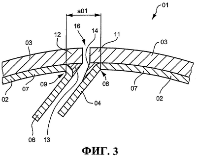 Образование скошенных кромок 08 и 09 на кромкогибочном станке производится таким образом, чтобы оба конца 11 и 12 декельного полотна 03 немного выступали над скошенными кромками 08 и 09. Полость между выступающими концами 11 и 12 декельного полотна 03, с одной стороны, и несущей пластиной 02, с другой стороны, заделывают заполняющей массой 13; 14, обозначаемой также как опорный элемент 13 и 14. Заполняющая масса 13 и 14 может быть получена, например, путем нанесения отверждаемой резиновой массы.