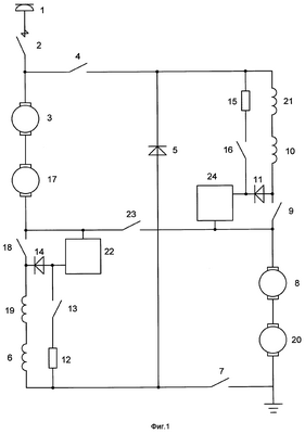 В соответствии с фигурой 1 устройство для регулирования скорости электроподвижного состава, содержит последовательно соединенные источник питания 1, выключатель 2, якорную обмотку 3 первого тягового двигателя постоянного тока, к общему выводу выключателя 2 и якорной обмотки 3 первого тягового двигателя постоянного тока подключен первый контактор 4, его свободный вывод соединен с катодом первого диода 5, анод которого соединен с общим выводом обмотки возбуждения 6 первого тягового двигателя постоянного тока и второго контактора 7, последовательно соединенные якорную обмотку 8 второго тягового двигателя постоянного тока, третий контактор 9 и обмотку возбуждения 10 второго тягового двигателя постоянного тока, к общему выводу обмотки возбуждения 10 второго тягового двигателя постоянного тока и третьего контактора 9 подключен анод второго диода 11, последовательно соединенные первый резистор 12, четвертый контактор 13 и анод третьего диода 14, последовательно соединенные второй резистор 15 и пятый контактор 16, к свободному выводу якорной обмотки 3 первого тягового двигателя постоянного тока подключены последовательно соединенные якорная обмотка 17 третьего тягового двигателя постоянного тока, шестой контактор 18, обмотка возбуждения 19 третьего тягового двигателя постоянного тока, ее свободный вывод соединен с свободным выводом обмотки возбуждения 6 первого тягового двигателя постоянного тока, к общему выводу шестого контактора 18 и обмотки возбуждения 19 третьего тягового двигателя постоянного тока подключен катод третьего диода 14, свободный вывод первого резистора 12 соединен с общим выводом обмотки возбуждения 6 первого тягового двигателя постоянного тока и второго контактора 7, свободный вывод которого соединен с общим выводом якорной обмотки 20 четвертого тягового двигателя постоянного тока и землей, свободный вывод якорной обмотки 20 четвертого тягового двигателя постоянного тока соединен с свободным выводом якорной обмотки 8 второго тягового двигателя постоянного тока, свободный вывод обмотки возбуждения 10 второго тягового двигателя постоянного тока соединен через обмотку возбуждения 21 четвертого тягового двигателя постоянного тока с общим выводом первого контактора 4, катодом первого диода 5 и свободным выводом второго резистора 15, катод второго диода 11 соединен с свободным выводом пятого контактора 16, к общему выводу якорной обмотки 17 третьего тягового двигателя постоянного тока и шестого контактора 18 подключен вход первого цифроаналогового преобразователя (ЦАП) 22, его выход соединен с анодом третьего диода 13, вход первого цифроаналогового преобразователя 22 соединен через седьмой контактор 23 с выходом второго цифроаналогового преобразователя 24 и общим выводом якорной обмотки 8 второго тягового двигателя постоянного тока и третьего контактора 9, вход второго цифроаналогового преобразователя 24 соединен с катодом второго диода 11.
