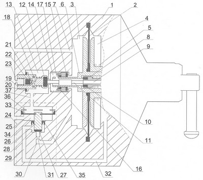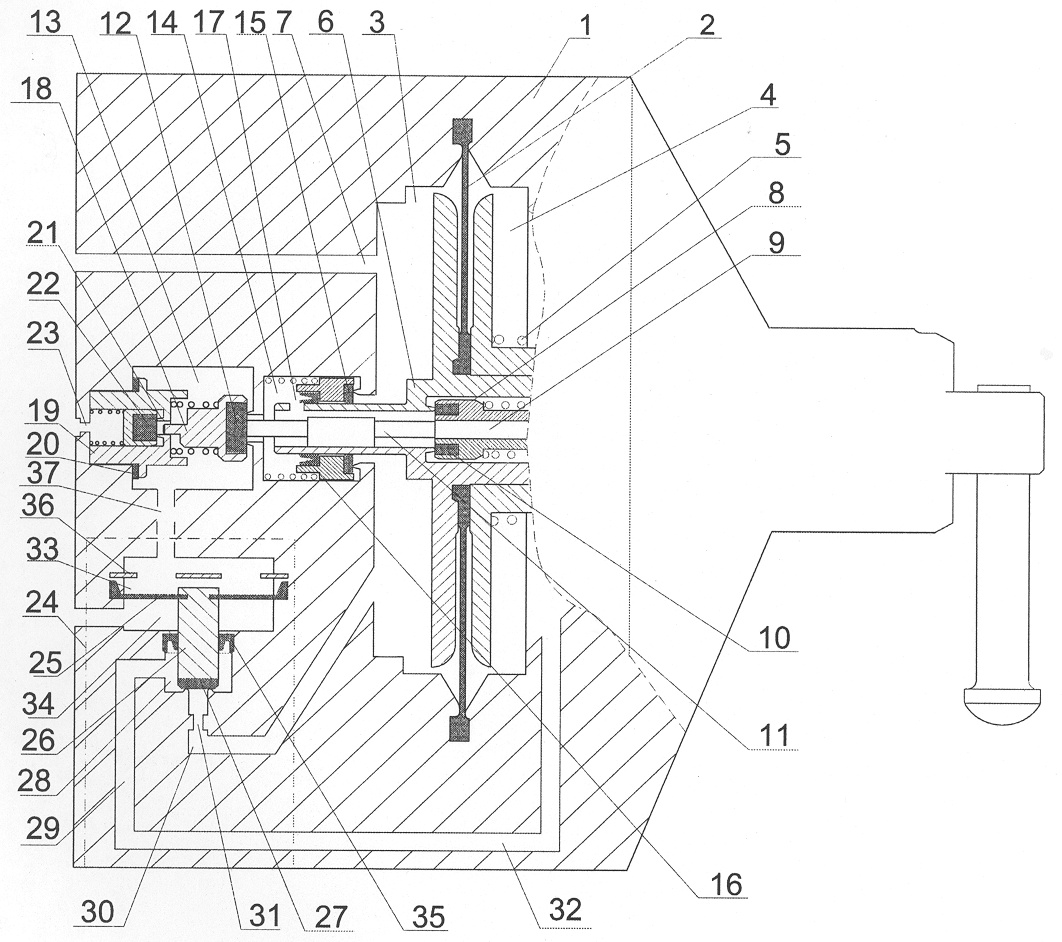 Канал 37, связывающий канал дополнительной разрядки 13 с камерой выравнивания давления 33, условно показан пунктиром. Камера выравнивания давления может быть сообщена и с другим источником давления, например с рабочей камерой.