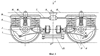 Рамы 3 тележки расположены в горизонтальной плоскости ниже оси колесных пар 1 и выполнены незамкнутыми, например [-образной формы, состоящих каждая из средней части и двух боковых частей. К средней части присоединена дополнительная балка 4, на которой размещены детали тормозных устройств 5 и кронштейн 6 крепления продольного поводка 7.